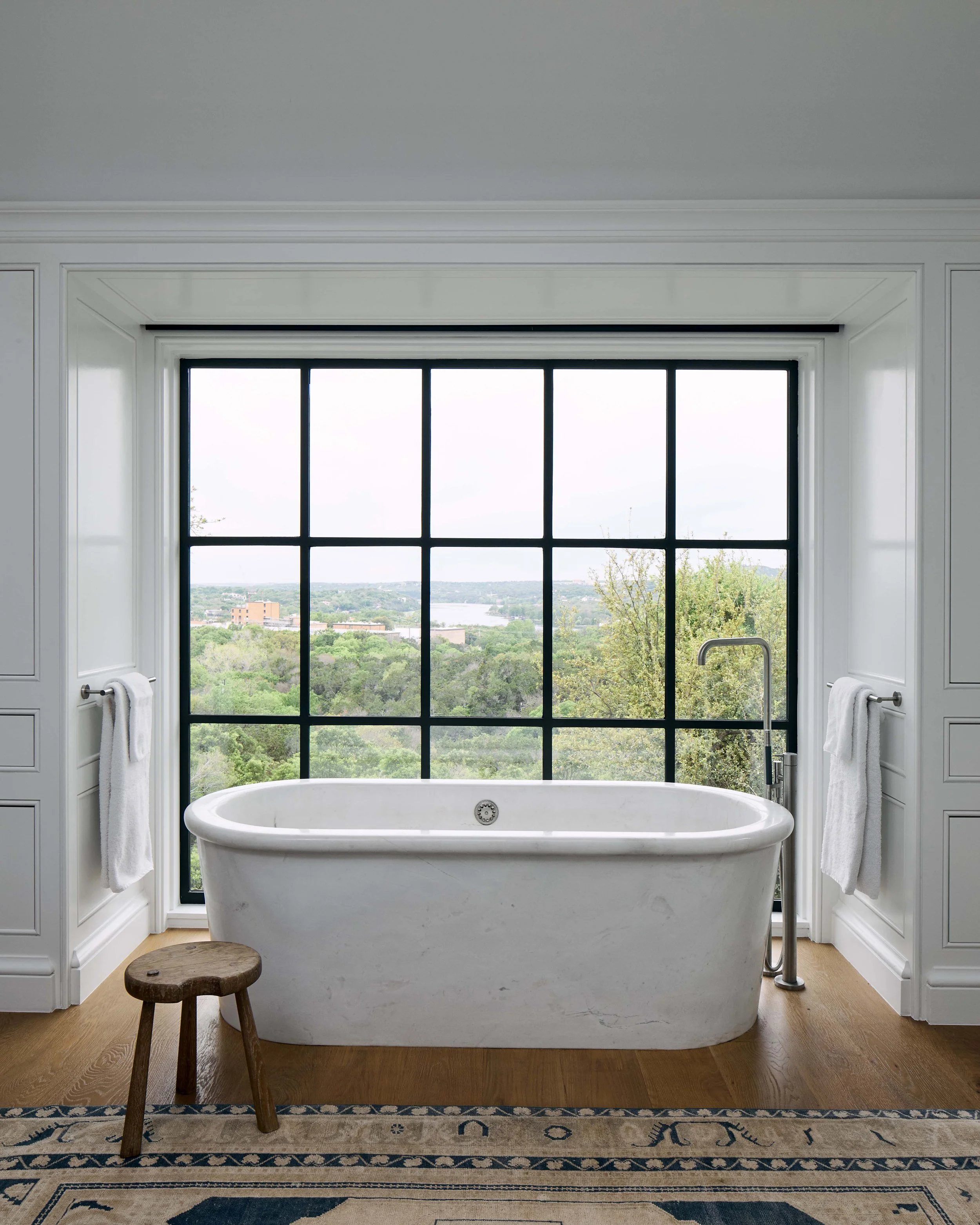 “The paneled living room in this contemporary lake house takes cues from Sir John Soane's Dulwich Picture Gallery in London, setting an ideal backdrop for gathering. The lime wash finish in the space feels “painted over time, giving it a wisdom and maturity.”