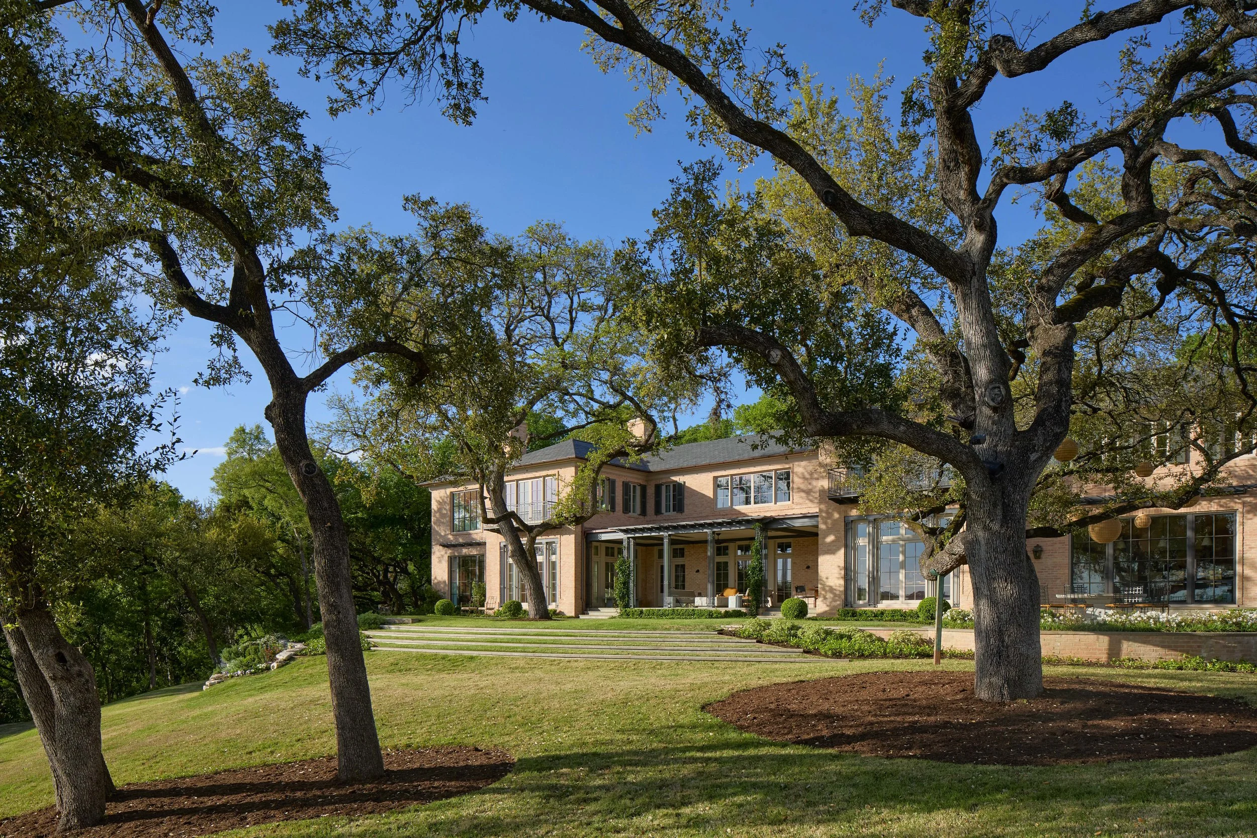 Perched on nine acres of densely treed land overlooking Lake Austin, this contemporary lake house occupies a rare elevated site within the city. Its placement carefully preserves the property’s colossal live oaks while responding to strict local tree-protection regulations. The design balances traditional and modern influences, with a symmetrical front façade for privacy and a transparent rear opening onto terraces and a serene pool, framing uninterrupted views of the lake and rolling wooded hills. A long, shallow plan extends through the house, linking an enfilade of rooms that each engage differently with the landscape. Brick and steel elements animate the façade, providing texture and contrast while complementing the natural tones of the site. The adjacent outdoor spaces are designed for year-round use, with terraces, porches, and fireplaces extending living areas into nature and emphasizing the connection between the home and landscape.