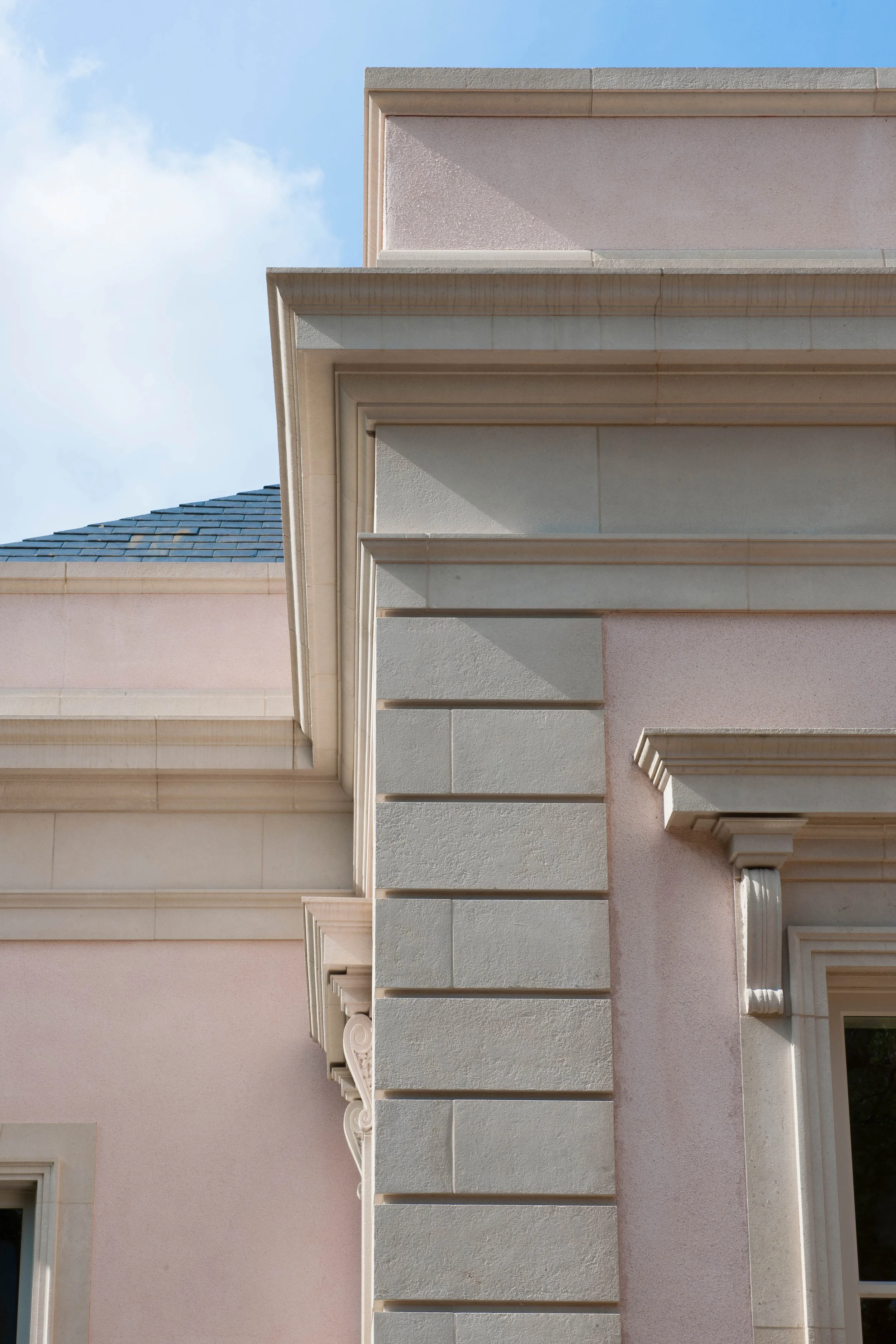 With this project, we approached the stimulating task of adapting the scale and volume of a typical eighteenth-century French residence to a twenty-first-century neighborhood lot in Houston, Texas. We sought to create a program of rooms that would satisfy both the social and private needs of our clients, all while uniting and formalizing the function of the surrounding landscape… a true aesthetic balancing act. The L-shaped house that resulted from these challenges realizes the full potential of a French salon, which is carefully distanced from the comparatively private residential structure. Artful terraces, porches, gardens, and pavilions both resolve the architectural plan and provide a verdant background to compliment the pale pink stucco and bright limestone facing of the property.